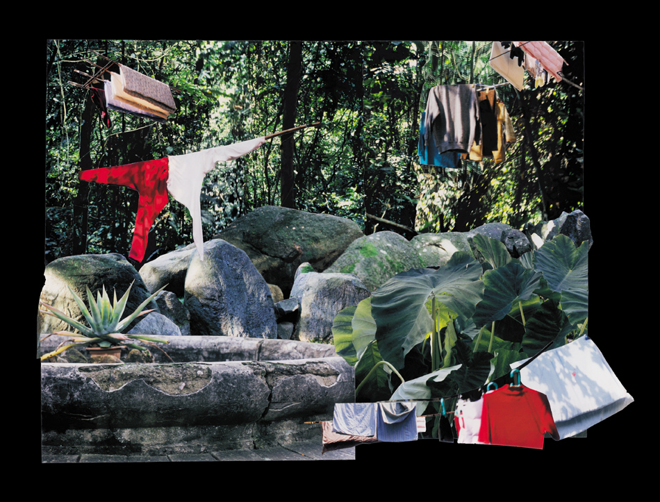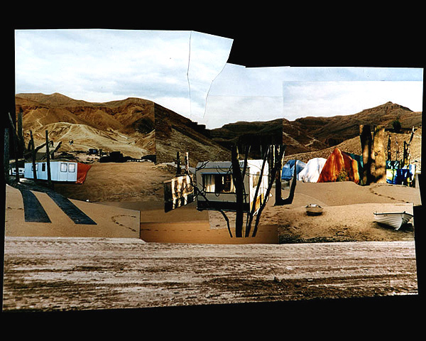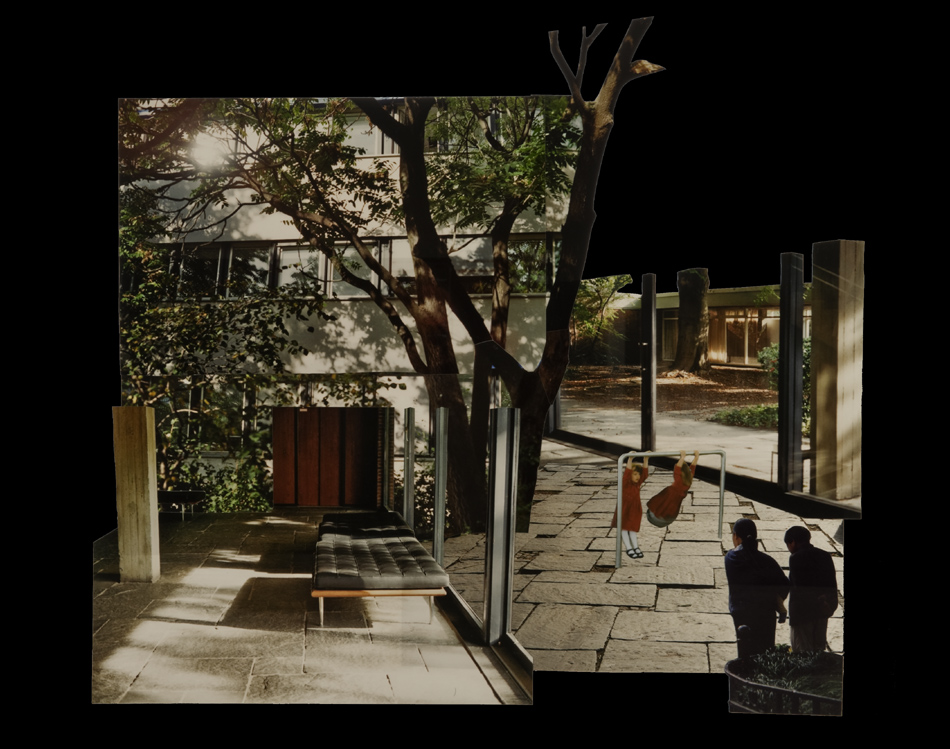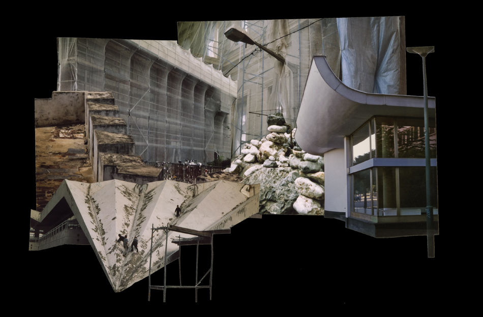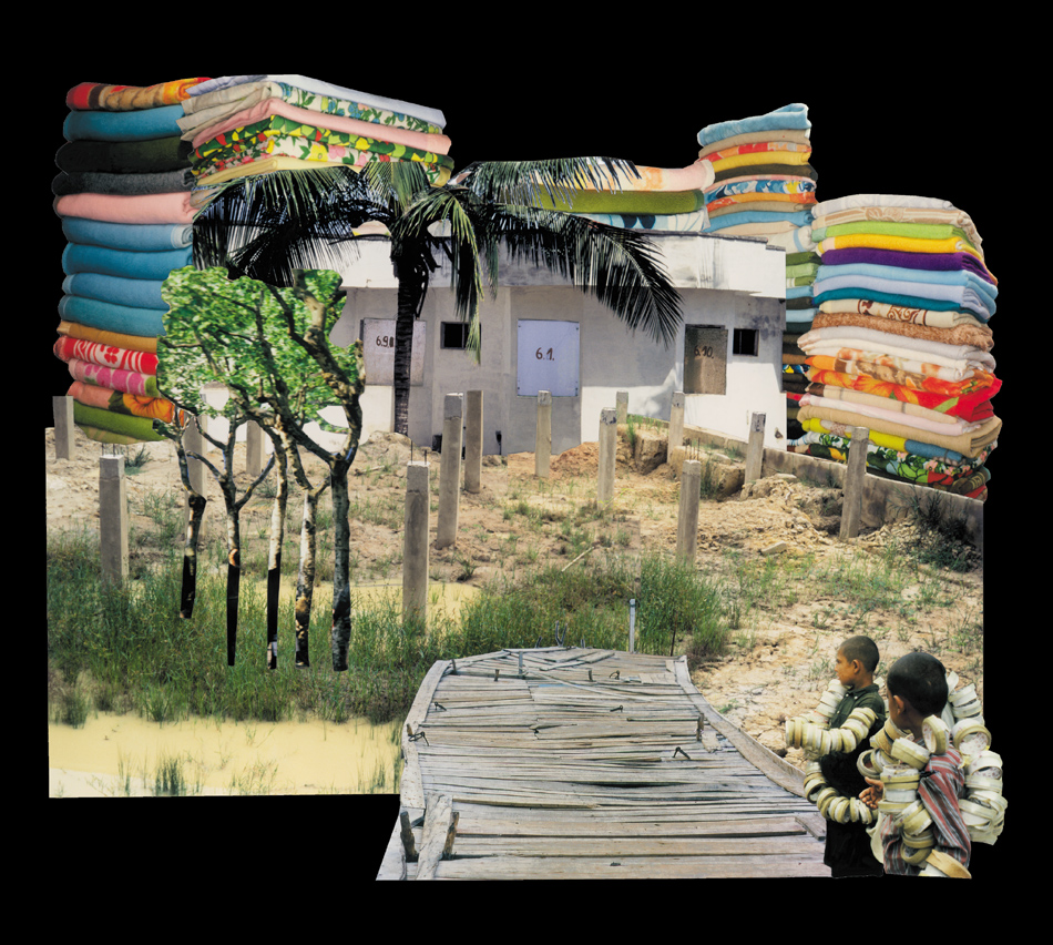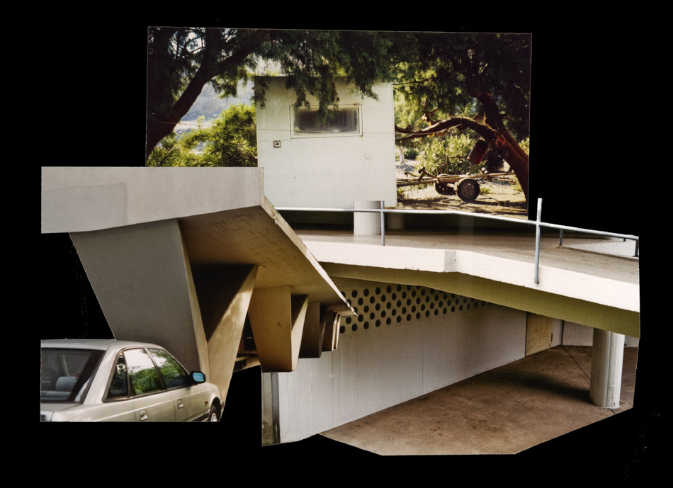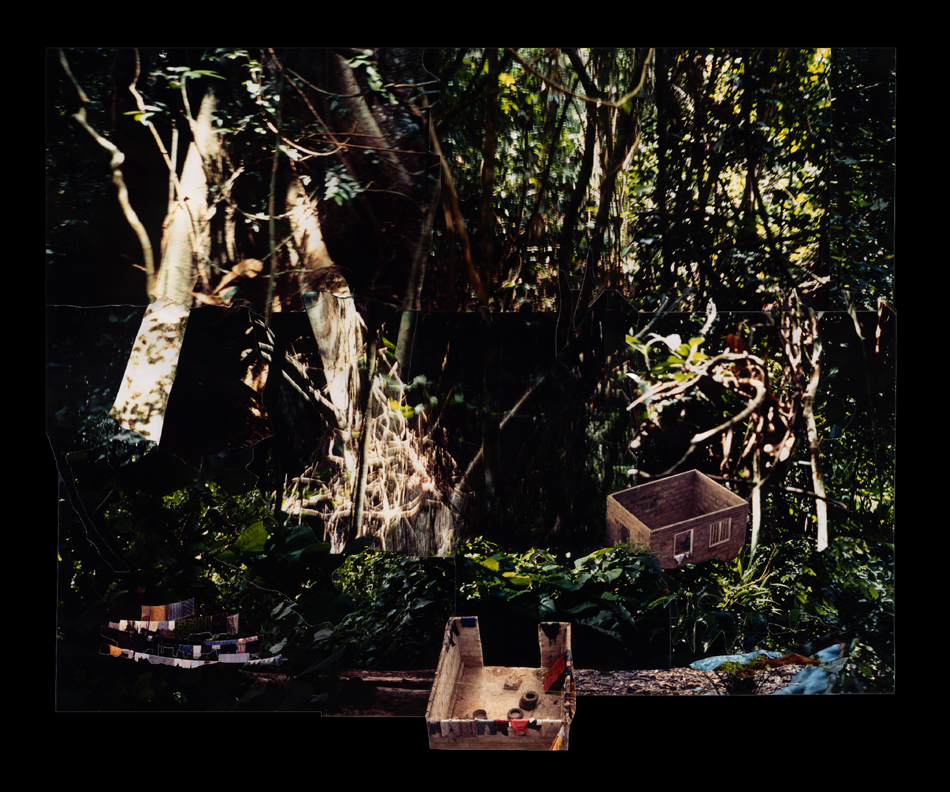 Fotocollagen als Entwürfe von bewohnbaren Strukturen: Häuser, Hütten und Unterstände in idealen Landschaften.