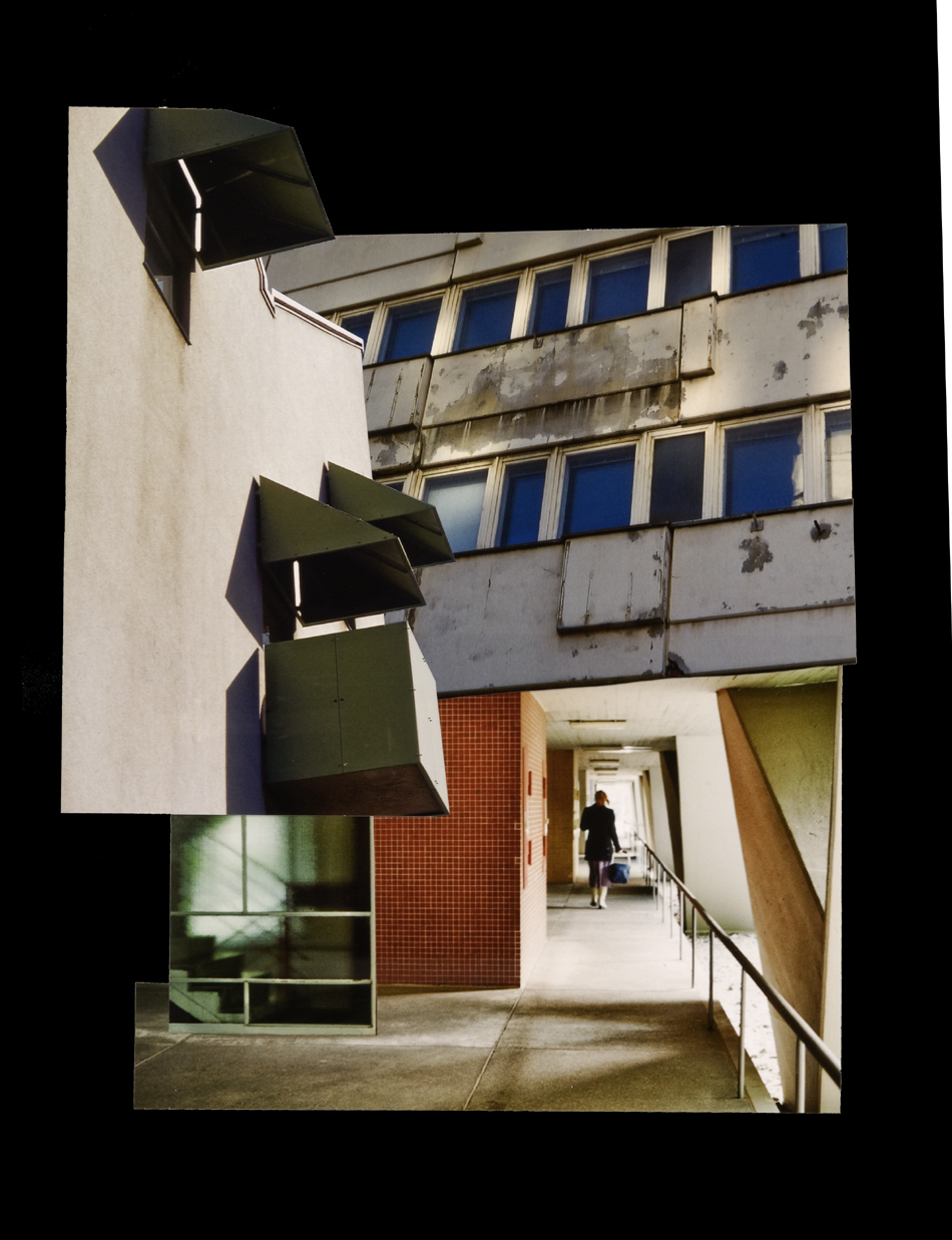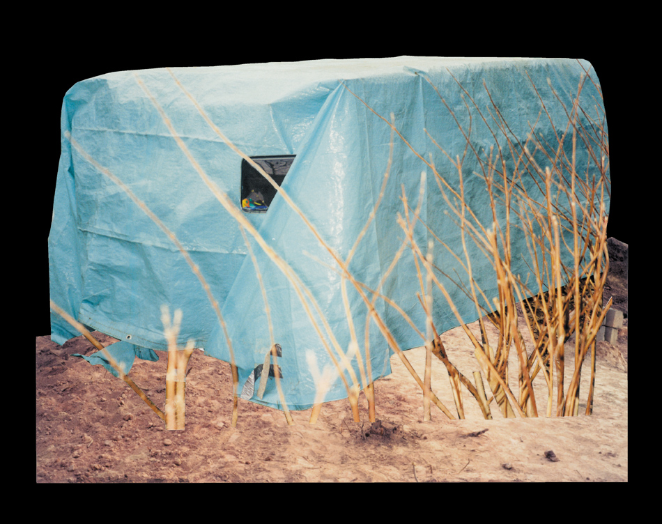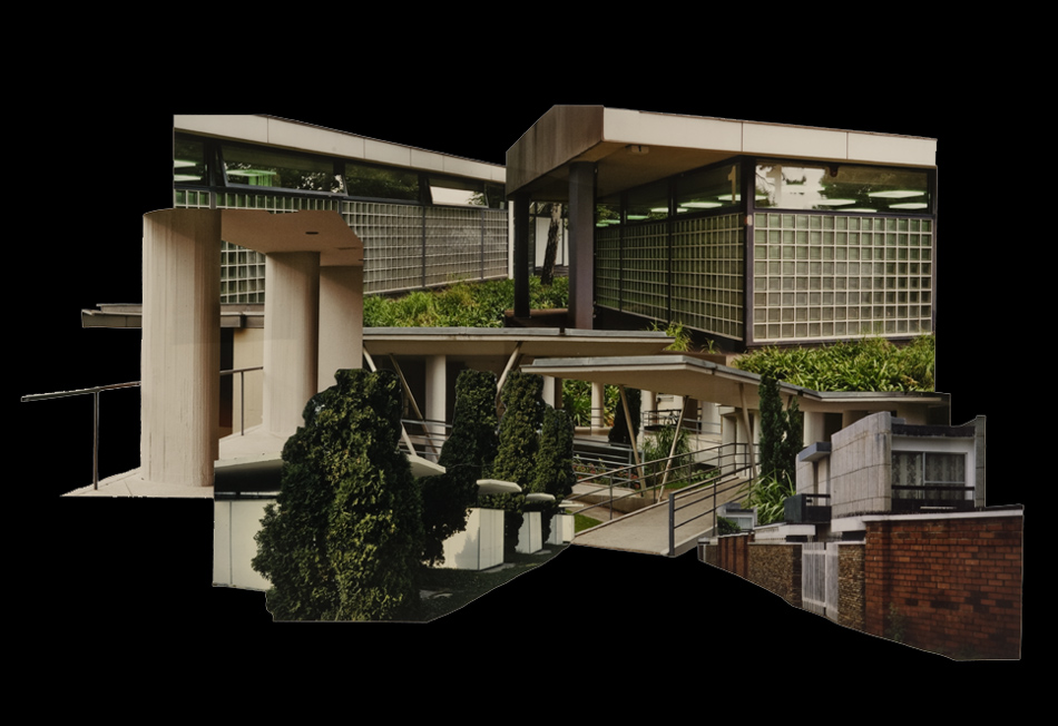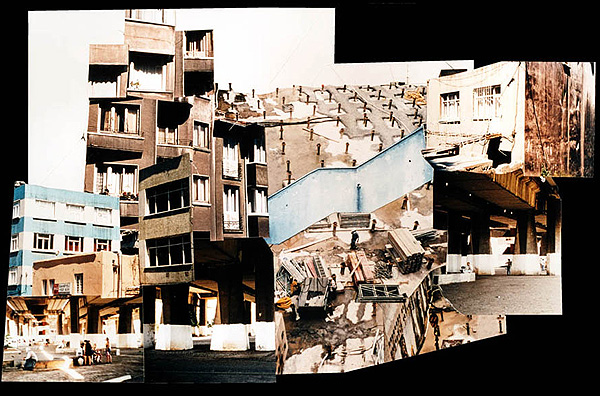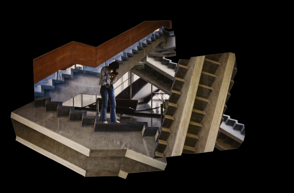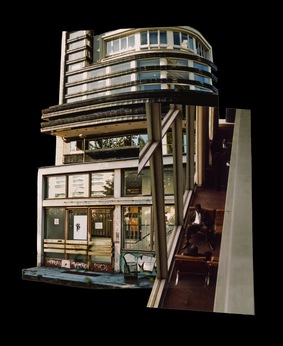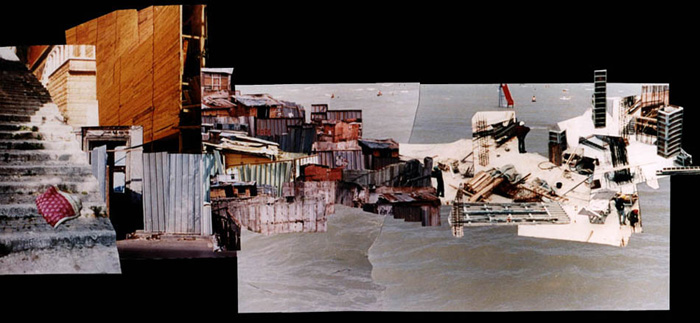 Fotocollagen als Entwürfe von bewohnbaren Strukturen: Häuser, Hütten und Unterstände in idealen Landschaften.
