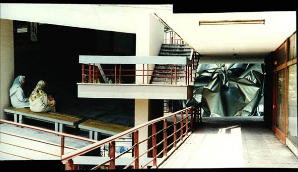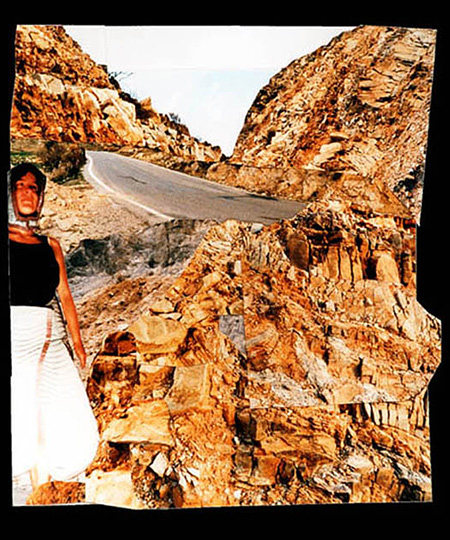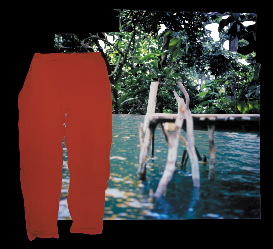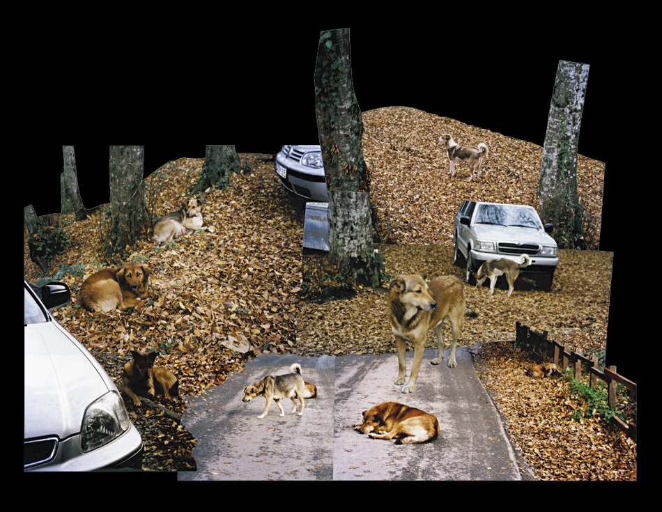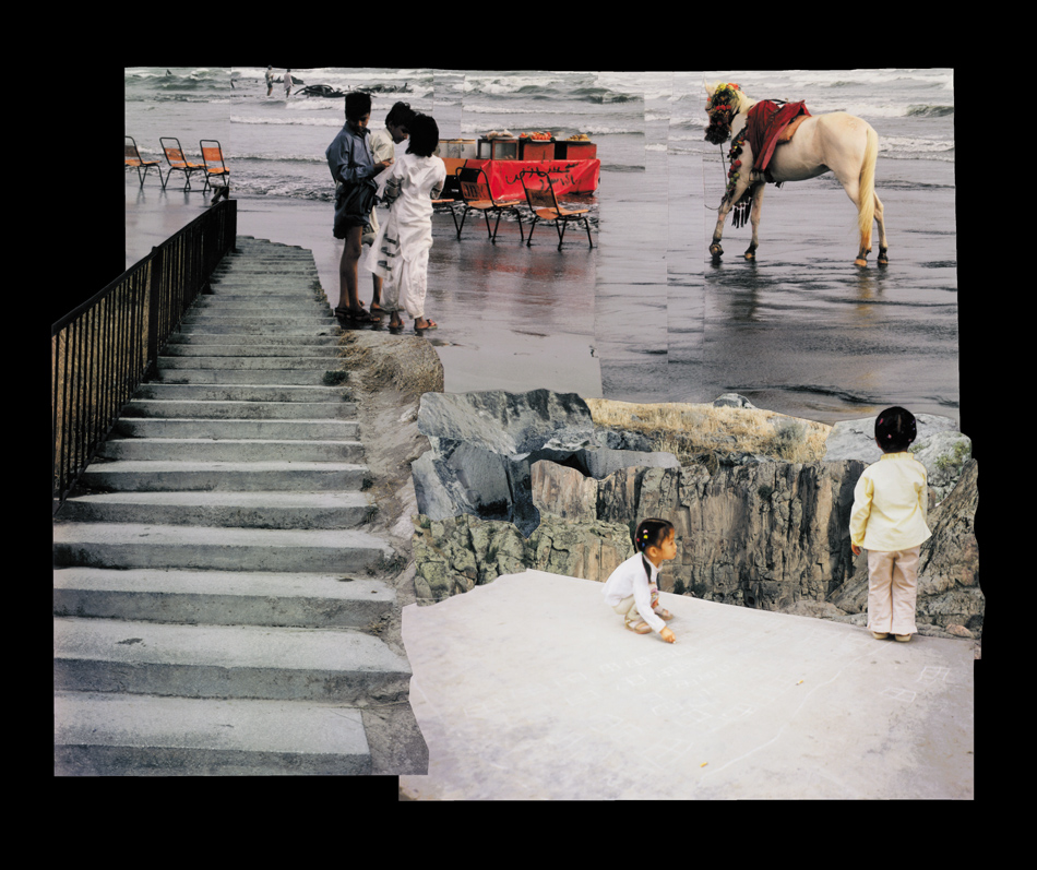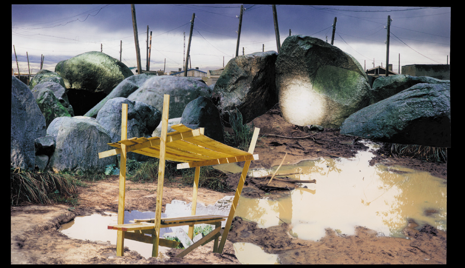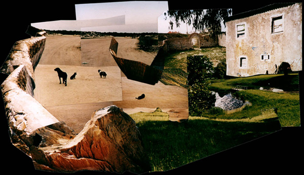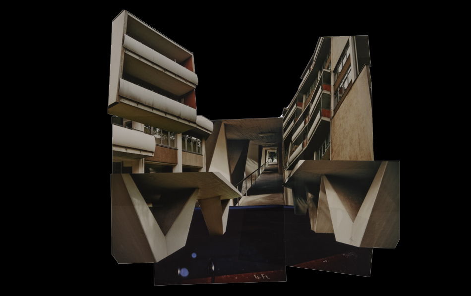 Fotocollagen als Entwürfe von bewohnbaren Strukturen: Häuser, Hütten und Unterstände in idealen Landschaften.
